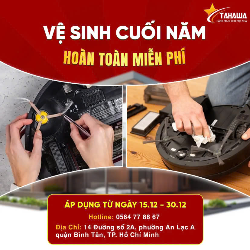 Vệ sinh robot hút bụi miễn phí dịp cuối năm" – Tahawa tri ân khách hàng với chương trình đặc biệt từ ngày 15/12 đến 30/12. Mang robot của bạn đến cửa hàng hoặc gửi về trung tâm bảo hành Tahawa để được làm sạch, kiểm tra và bảo dưỡng hoàn toàn miễn phí. Đảm bảo trợ thủ dọn dẹp của bạn hoạt động bền bỉ, giúp ngôi nhà sạch sẽ đón Tết. Đừng bỏ lỡ cơ hội!