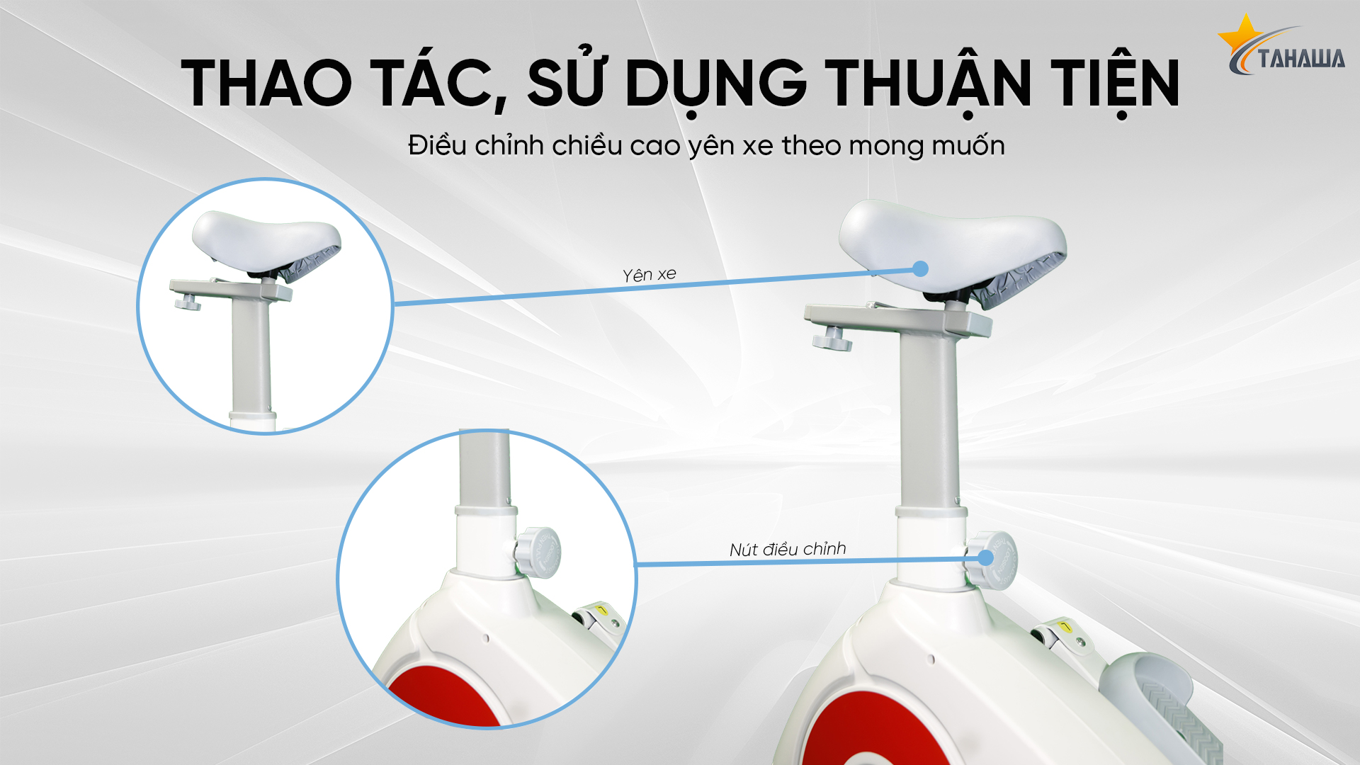 Ngoài ra, yên xe và cổ xe còn có các nấc điều chỉnh độ cao, giúp xe có thể phù hợp với nhiều vóc dáng khác nhau, mang đến sự thoải mái khi luyện tập.